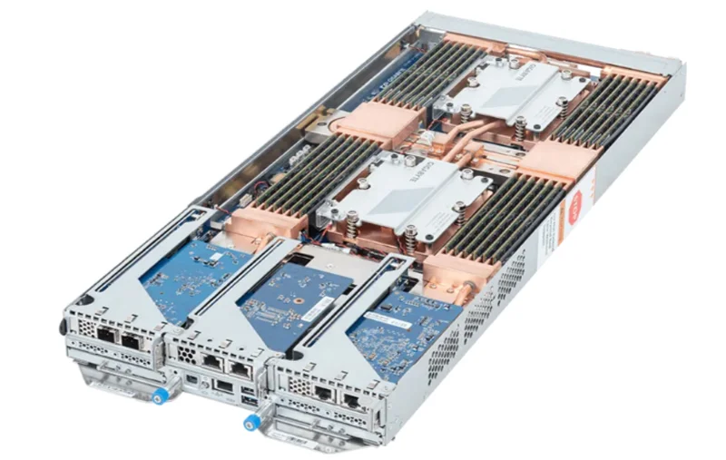 В каждом узле возможна установка двух процессоров AMD или в разъёме Socket SP5 (LGA 6096), с максимальным тепловыделением до 500 Вт. Подсистема памяти организована по 12-канальной схеме и поддерживает до 24 модулей DDR5-4800/6400.