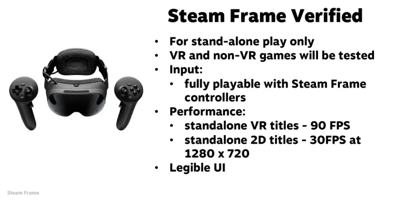 Что касается VR-шлема Steam Frame, для него не предусмотрена отдельная программа сертификации совместимости. По словам Valve, если игра стабильно работает на вашем компьютере, она будет так же хорошо функционировать и на Steam Frame. Для автономных VR-игр отсутствует уровень Frame Verified («подтверждено»). Существуют лишь две категории: Frame Test («требует проверки») и Frame Unsupported («несовместимо»).