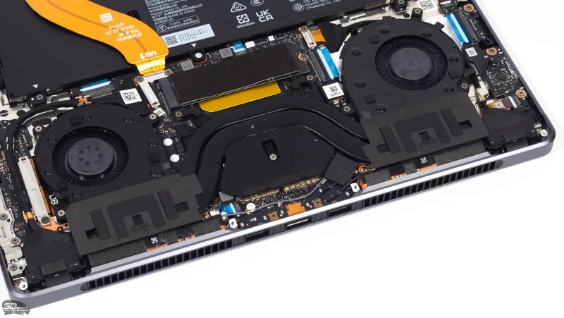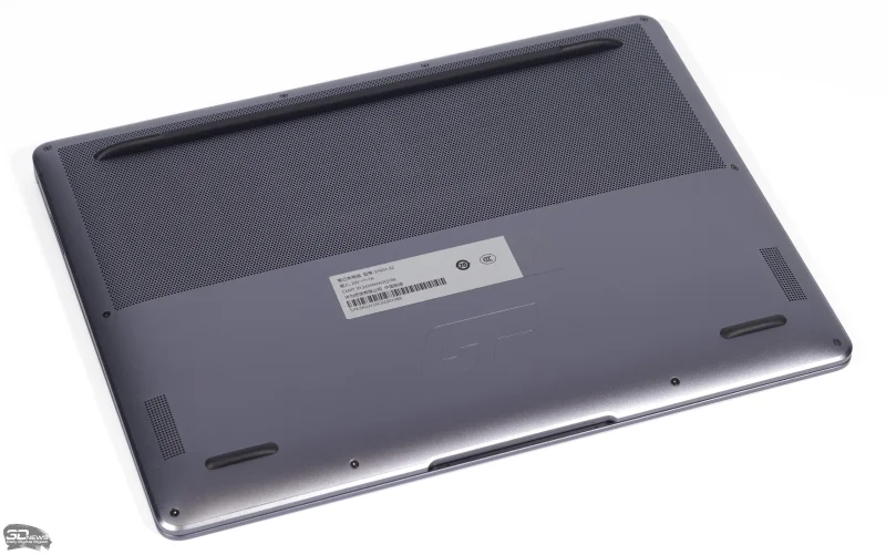 Как уже было отмечено, конструкция системы охлаждения HUAWEI MateBook GT 14 отличается тем, что горячий воздух направляется не вверх, как в большинстве случаев, а назад. При этом воздухозаборная решетка занимает ровно половину нижней поверхности корпуса, что соответствует расположению материнской платы внутри устройства.