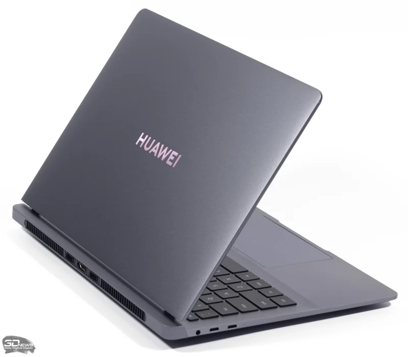 Тем не менее, при более внимательном изучении MateBook GT 14 можно заметить черты, более характерные для игровых, чем для рабочих устройств. Логотип HUAWEI на крышке имеет подсветку, а её задний торец в сложенном положении соединяется с выступом нижней части корпуса, где расположены вентиляционные решётки системы охлаждения и несколько внешних портов: два USB 3.2 Gen 1 формата Type-A и полноразмерный HDMI. Здесь же размещены антенны беспроводных модулей.