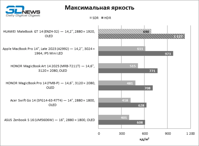 Дисплей HUAWEI MateBook GT 14 с технологией OLED выделяется не только четким изображением и плавной частотой обновления, но и впечатляющими показателями яркости: до 690 кд/м² в стандартном режиме SDR и 1 127 кд/м² при работе с HDR. Если же экран полностью заполнить белым цветом, яркость снижается до 612 и 835 кд/м² соответственно.
