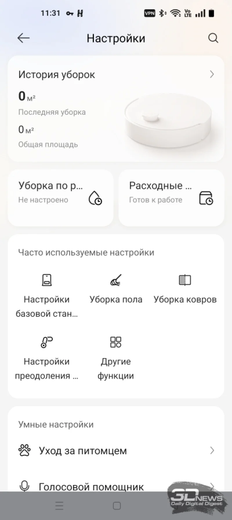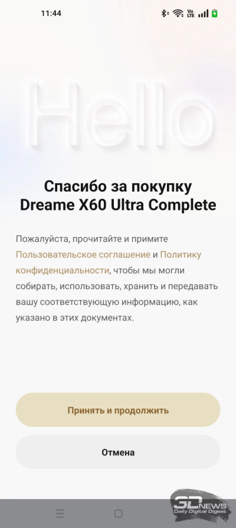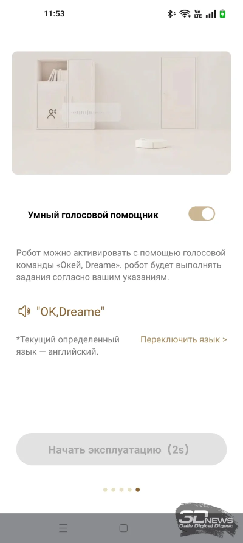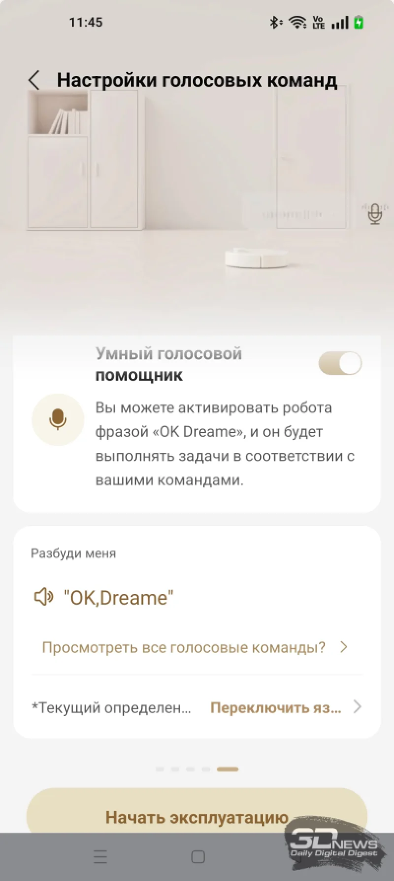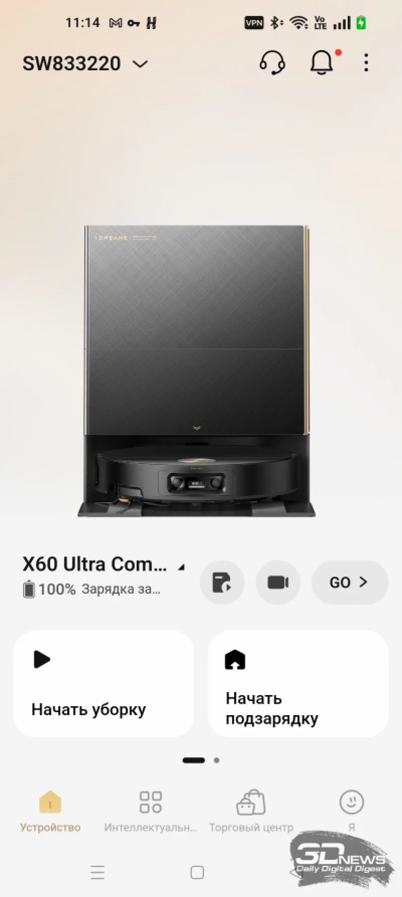 Чтобы «шестидесятая» модель функционировала корректно, требуется инсталлировать на телефон программу Dreamehome, которая существует для Android и iOS. Это приложение даёт возможность настраивать как сам робот-пылесос, так и его станцию автоматической очистки. Интерфейс утилиты полностью русифицирован и содержит множество вспомогательных указаний. Подсоединение устройства к домашней сети Wi-Fi с единым именем (SSID) для диапазонов 2,4 и 5 ГГц и смешанной защитой WPA2/WPA3 прошло без затруднений, а модель была распознана через QR-код. Весь процесс занял от силы пару минут — потребовались лишь регистрация в программе и доступ в сеть.