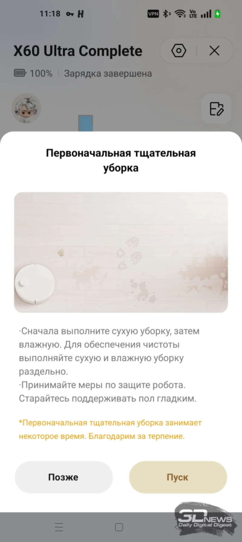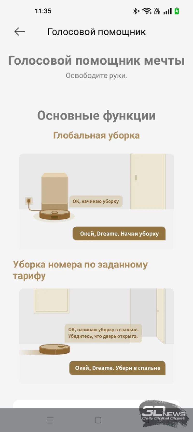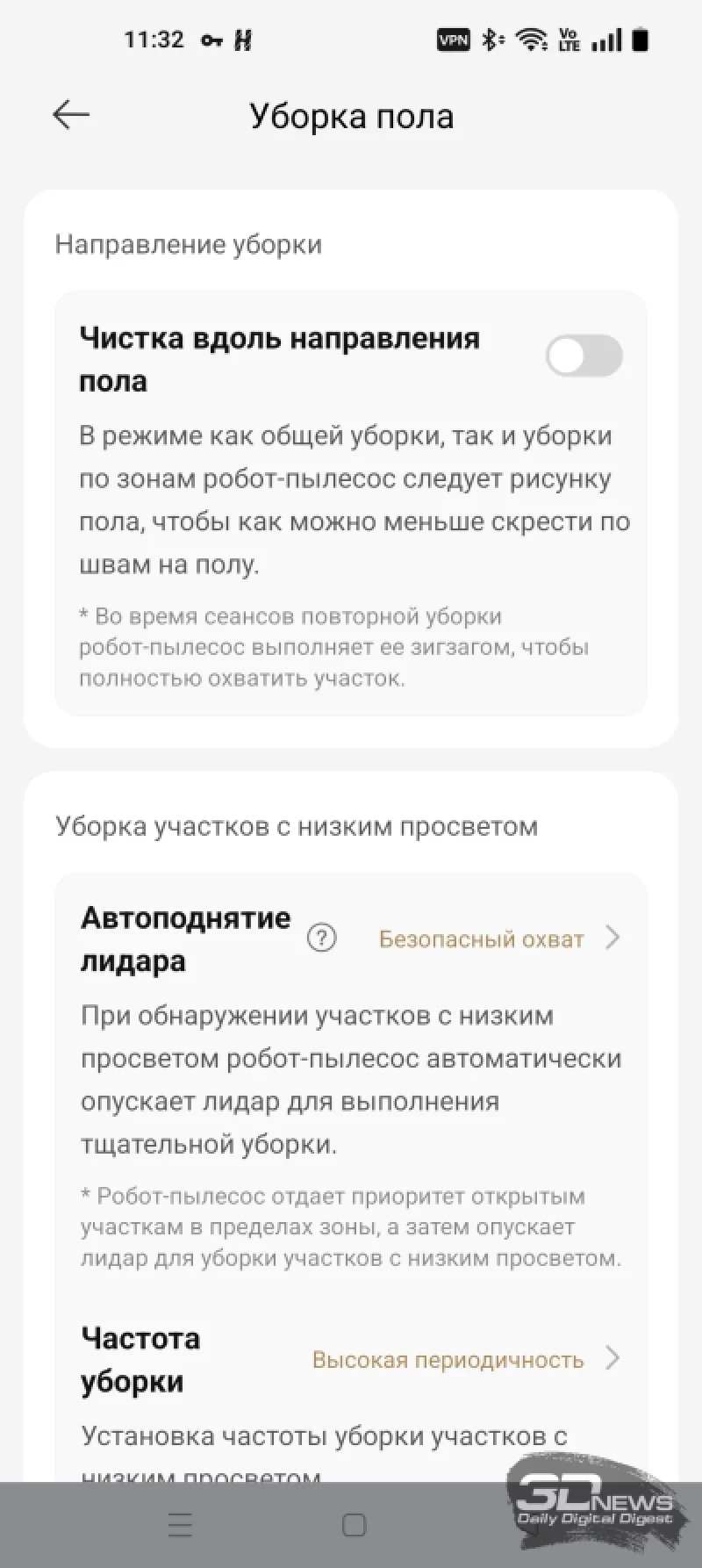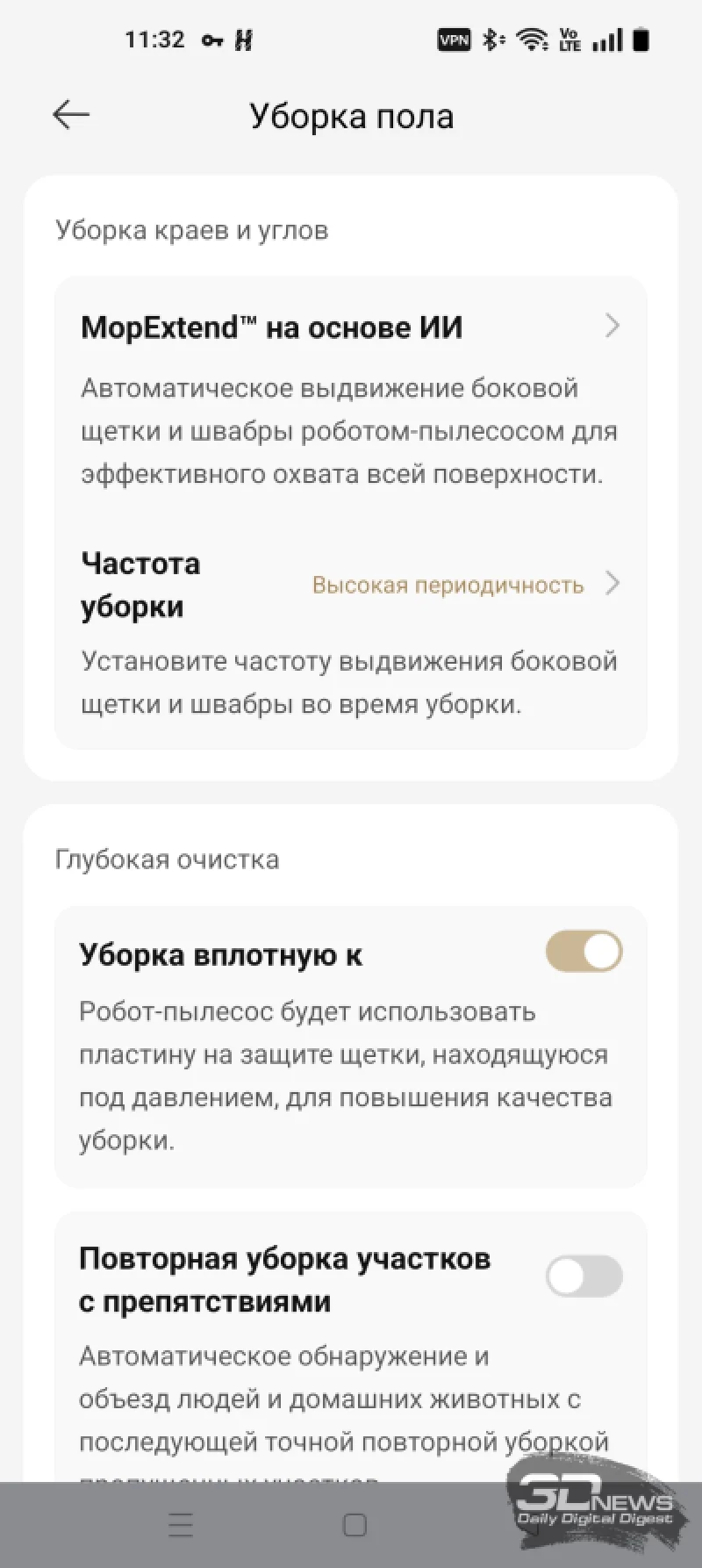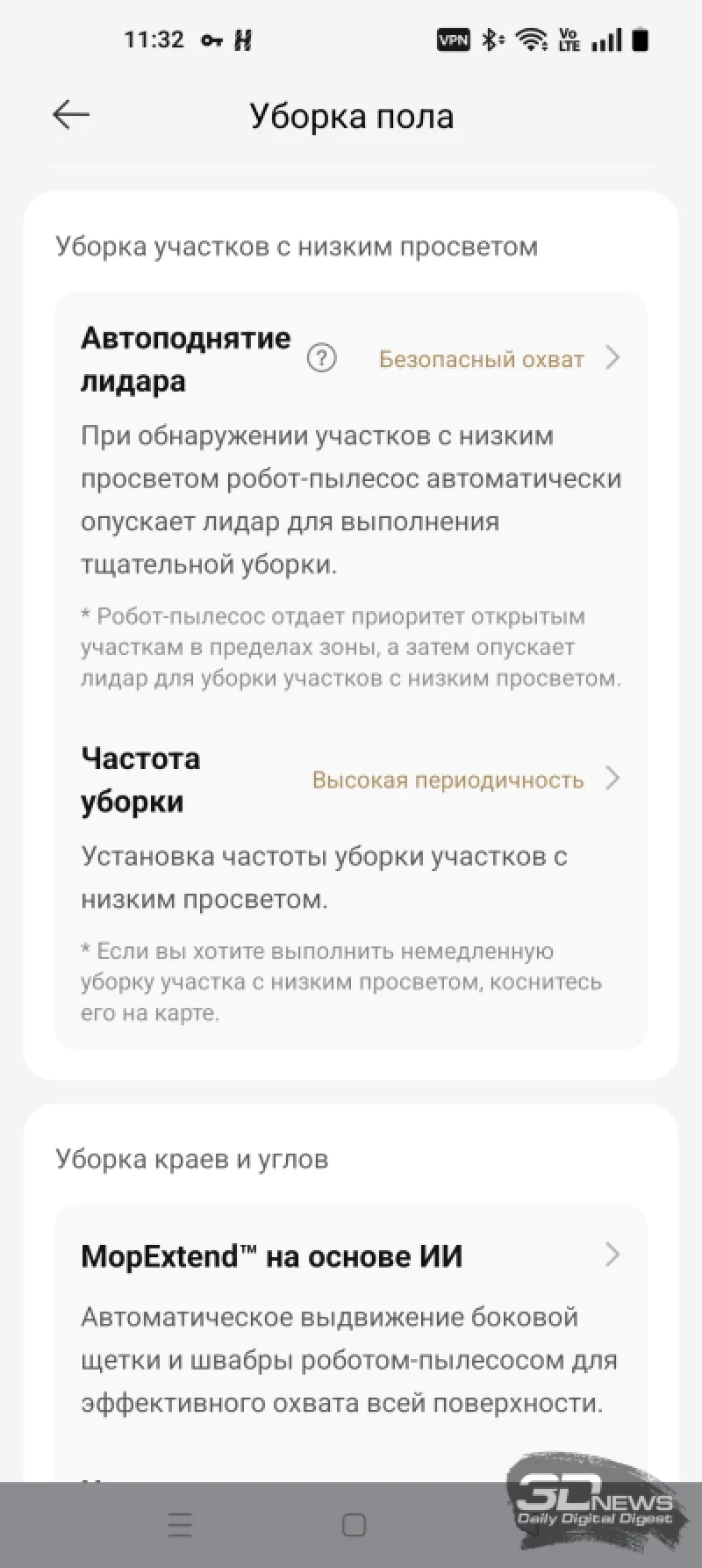 Чтобы «шестидесятая» модель функционировала корректно, требуется инсталлировать на телефон программу Dreamehome, которая существует для Android и iOS. Это приложение даёт возможность настраивать как сам робот-пылесос, так и его станцию автоматической очистки. Интерфейс утилиты полностью русифицирован и содержит множество вспомогательных указаний. Подсоединение устройства к домашней сети Wi-Fi с единым именем (SSID) для диапазонов 2,4 и 5 ГГц и смешанной защитой WPA2/WPA3 прошло без затруднений, а модель была распознана через QR-код. Весь процесс занял от силы пару минут — потребовались лишь регистрация в программе и доступ в сеть.