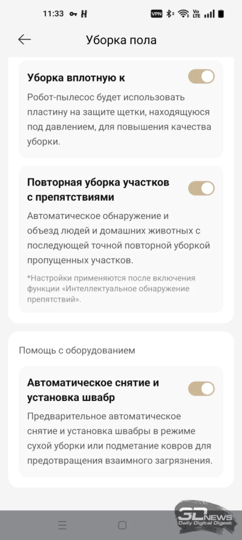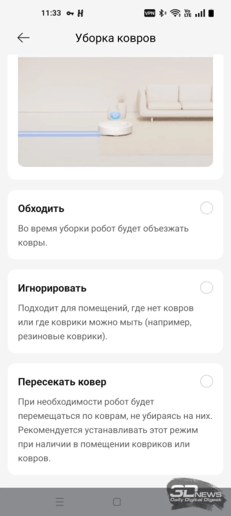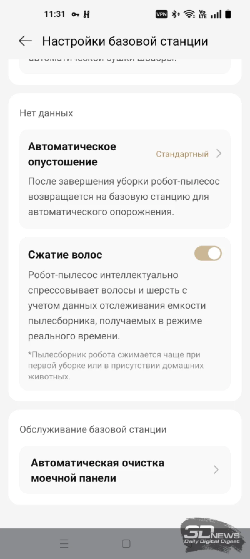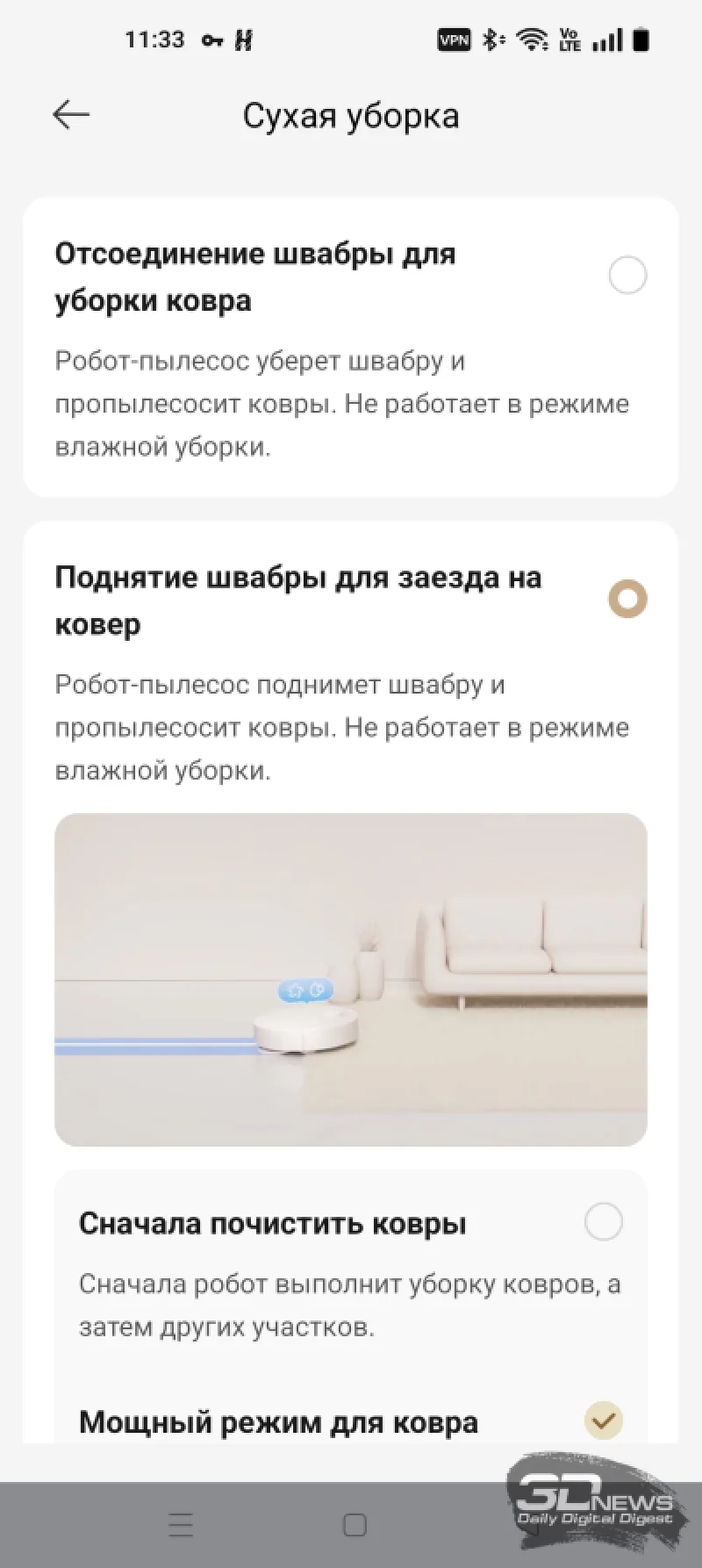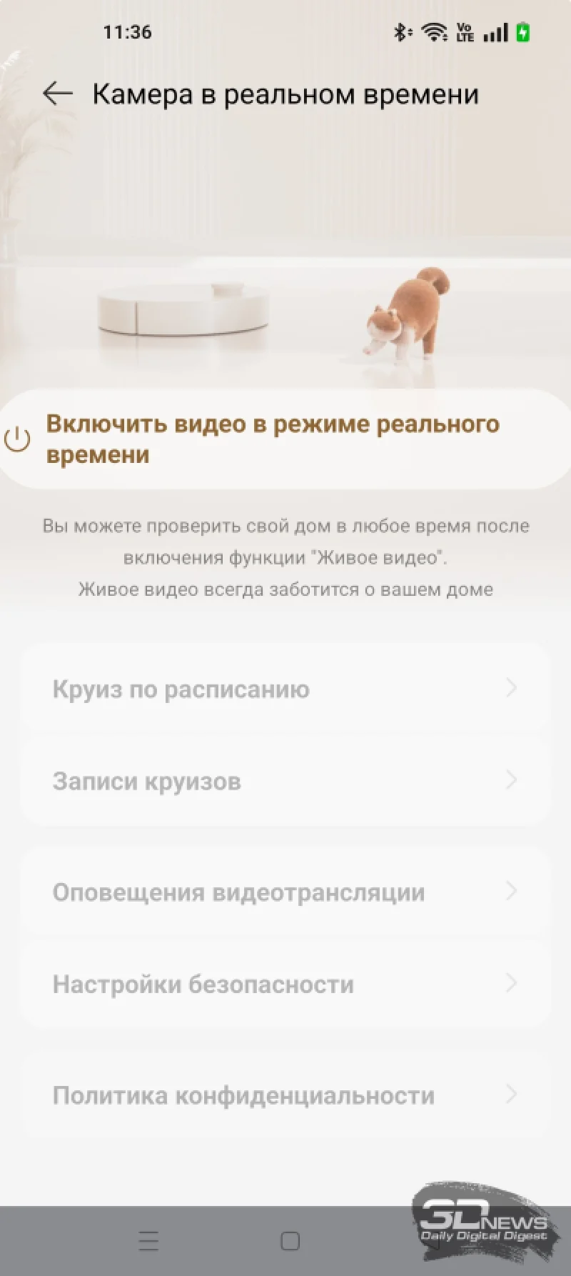Чтобы «шестидесятая» модель функционировала корректно, требуется инсталлировать на телефон программу Dreamehome, которая существует для Android и iOS. Это приложение даёт возможность настраивать как сам робот-пылесос, так и его станцию автоматической очистки. Интерфейс утилиты полностью русифицирован и содержит множество вспомогательных указаний. Подсоединение устройства к домашней сети Wi-Fi с единым именем (SSID) для диапазонов 2,4 и 5 ГГц и смешанной защитой WPA2/WPA3 прошло без затруднений, а модель была распознана через QR-код. Весь процесс занял от силы пару минут — потребовались лишь регистрация в программе и доступ в сеть.