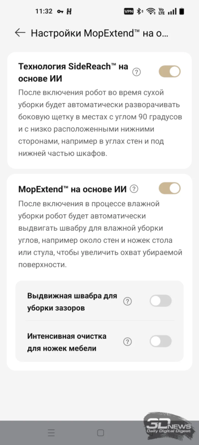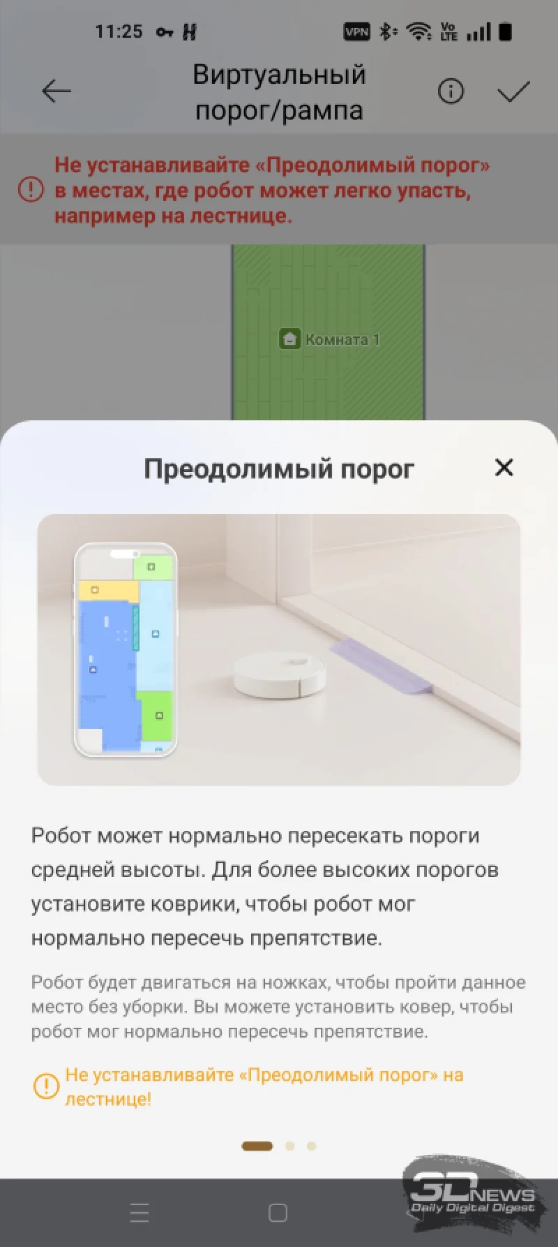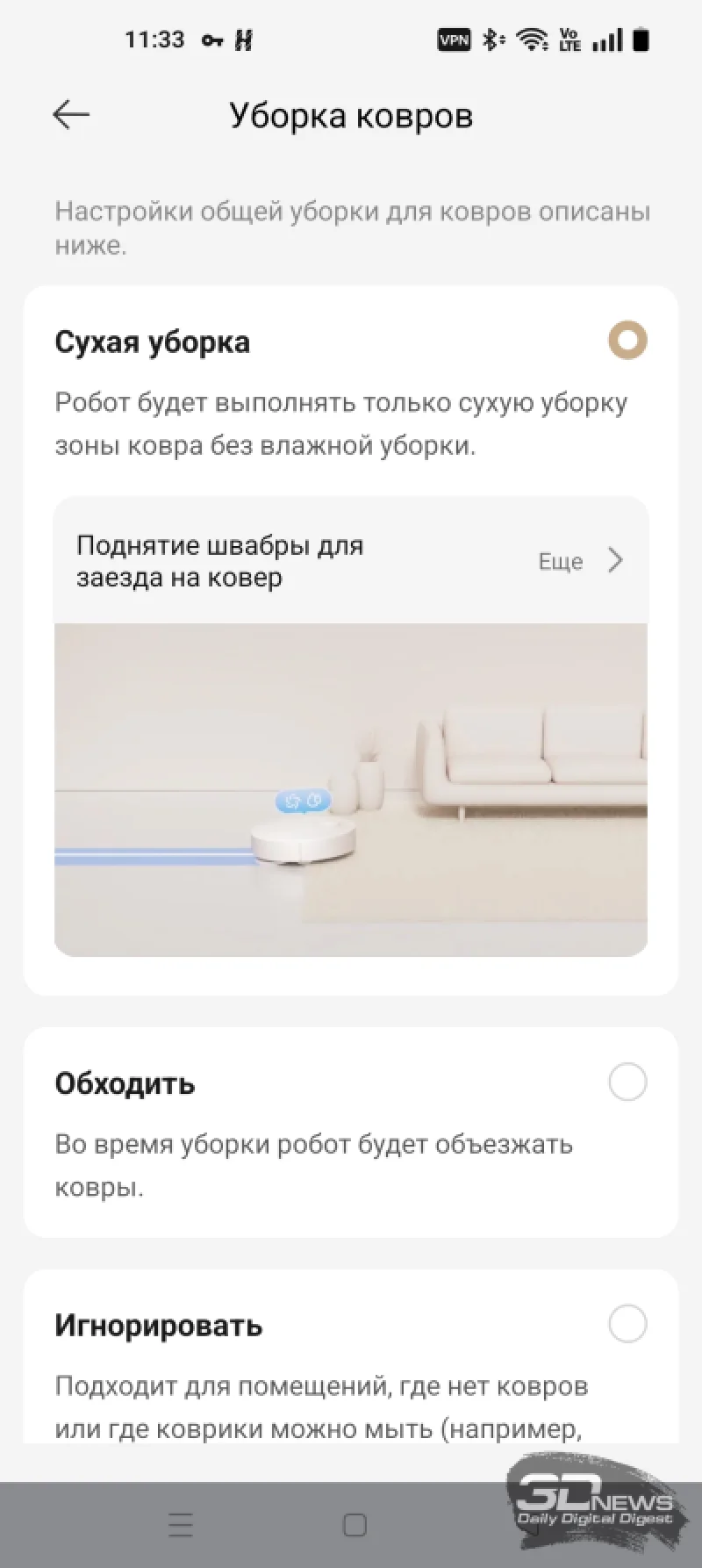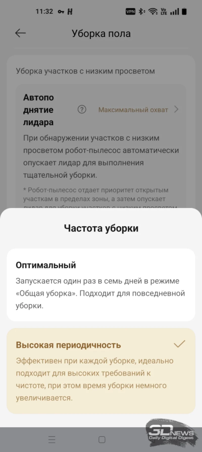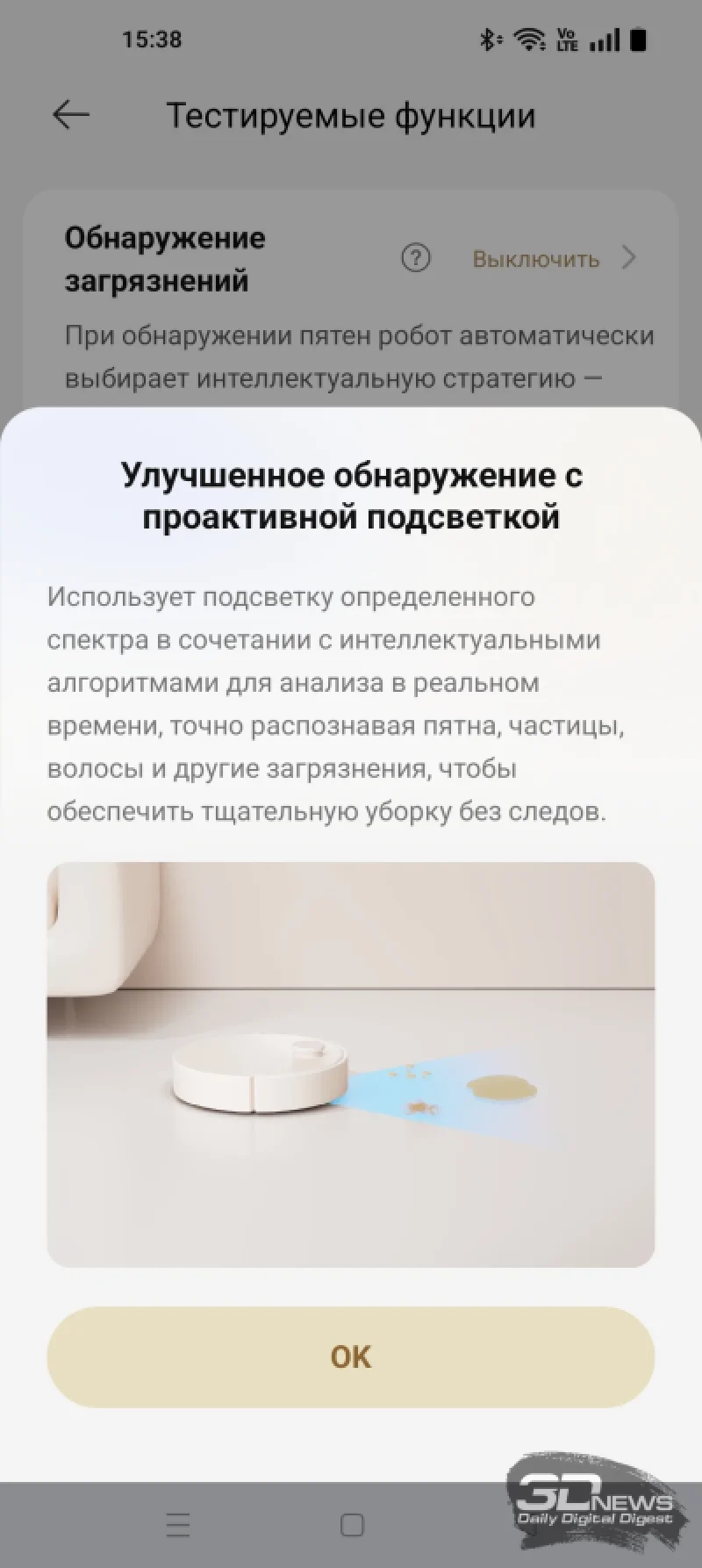 Чтобы «шестидесятая» модель функционировала корректно, требуется инсталлировать на телефон программу Dreamehome, которая существует для Android и iOS. Это приложение даёт возможность настраивать как сам робот-пылесос, так и его станцию автоматической очистки. Интерфейс утилиты полностью русифицирован и содержит множество вспомогательных указаний. Подсоединение устройства к домашней сети Wi-Fi с единым именем (SSID) для диапазонов 2,4 и 5 ГГц и смешанной защитой WPA2/WPA3 прошло без затруднений, а модель была распознана через QR-код. Весь процесс занял от силы пару минут — потребовались лишь регистрация в программе и доступ в сеть.