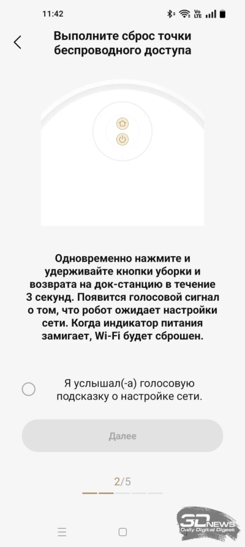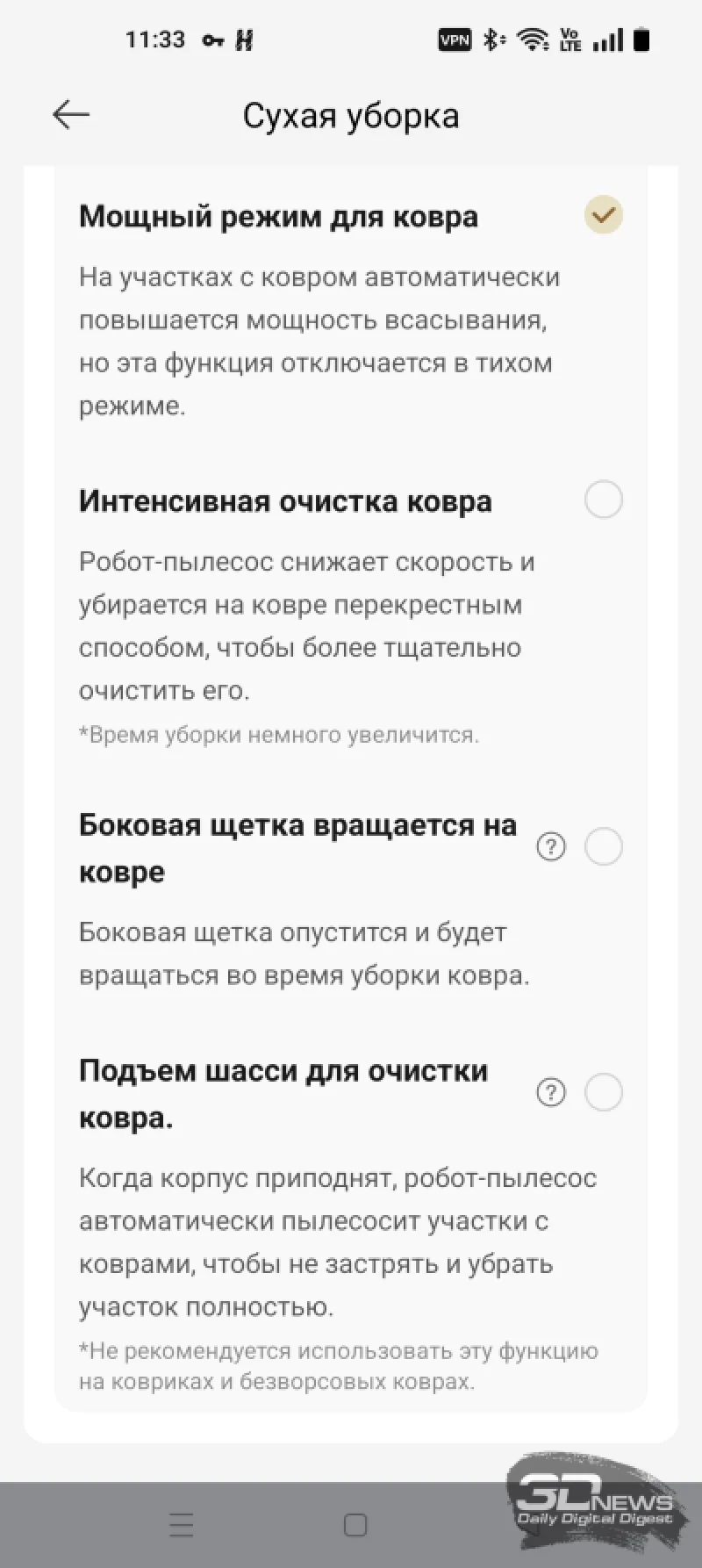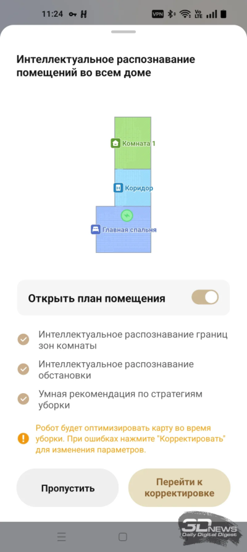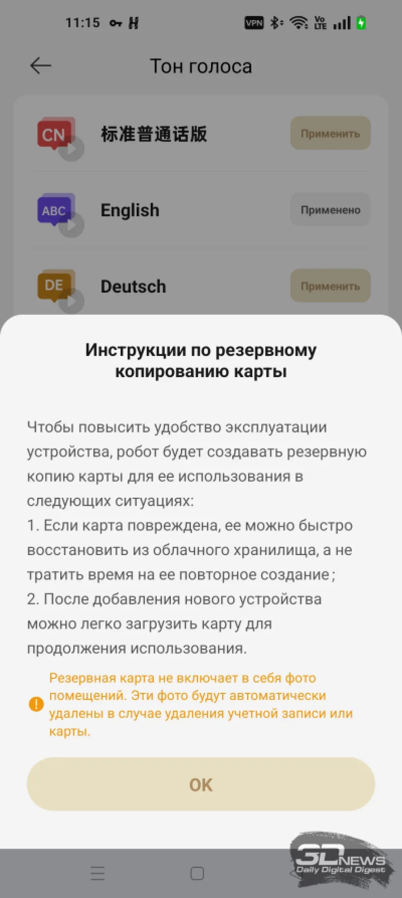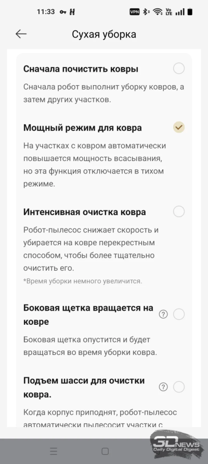 Чтобы «шестидесятая» модель функционировала корректно, требуется инсталлировать на телефон программу Dreamehome, которая существует для Android и iOS. Это приложение даёт возможность настраивать как сам робот-пылесос, так и его станцию автоматической очистки. Интерфейс утилиты полностью русифицирован и содержит множество вспомогательных указаний. Подсоединение устройства к домашней сети Wi-Fi с единым именем (SSID) для диапазонов 2,4 и 5 ГГц и смешанной защитой WPA2/WPA3 прошло без затруднений, а модель была распознана через QR-код. Весь процесс занял от силы пару минут — потребовались лишь регистрация в программе и доступ в сеть.