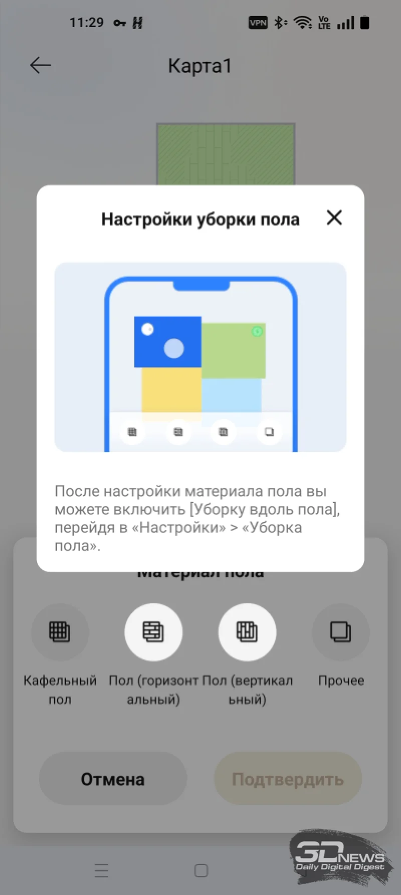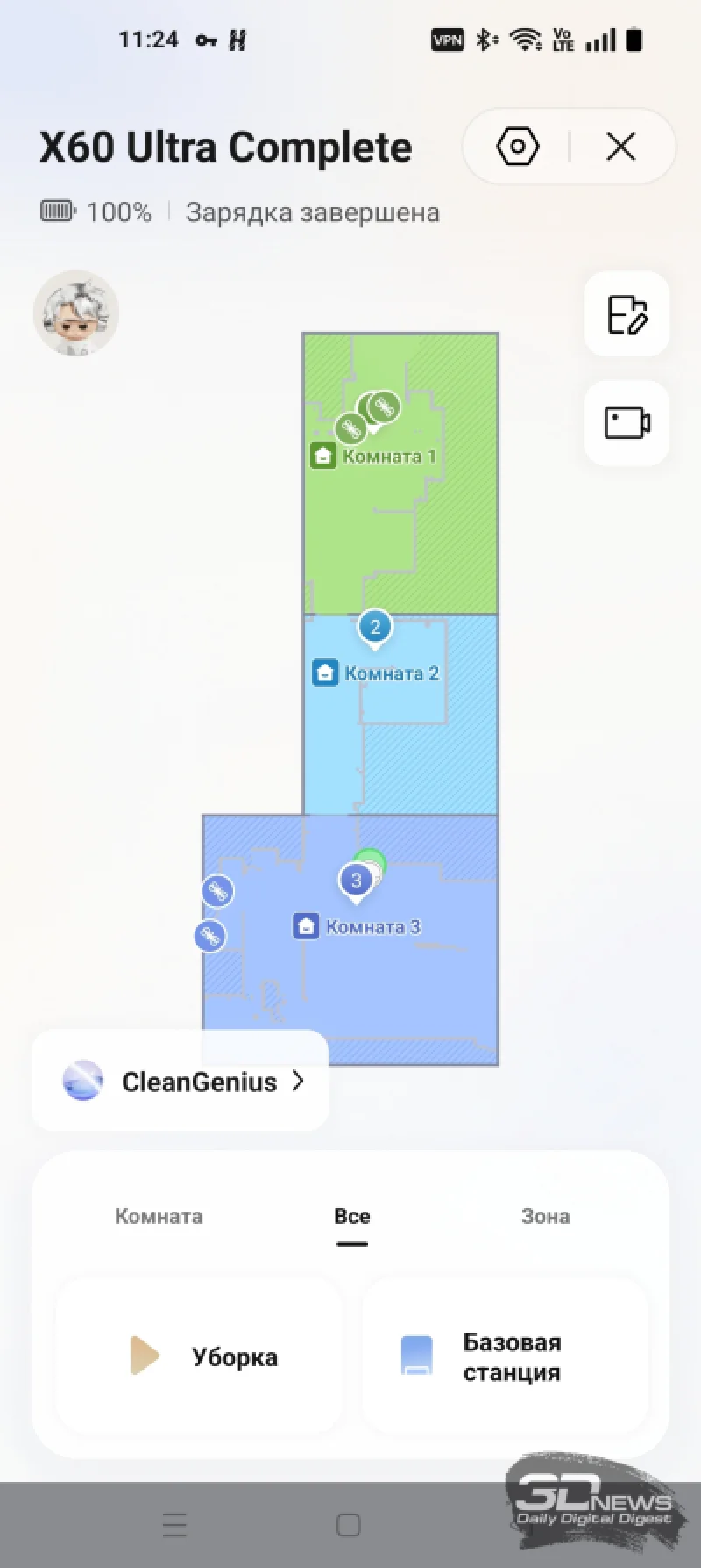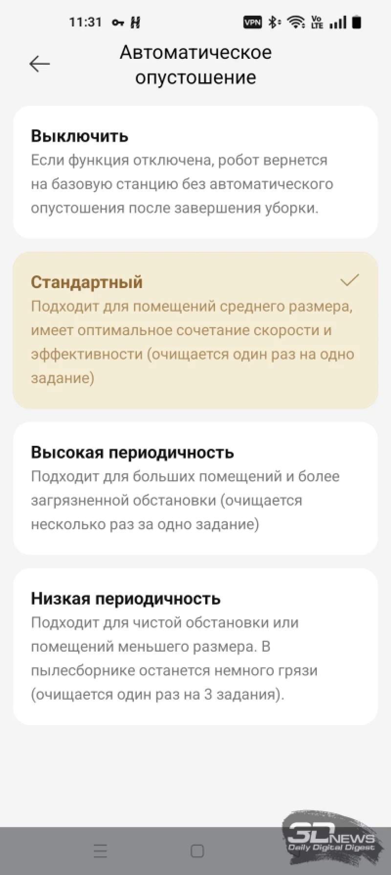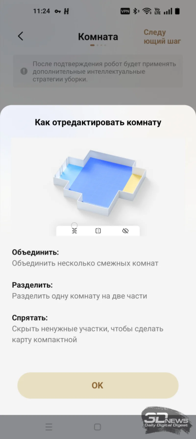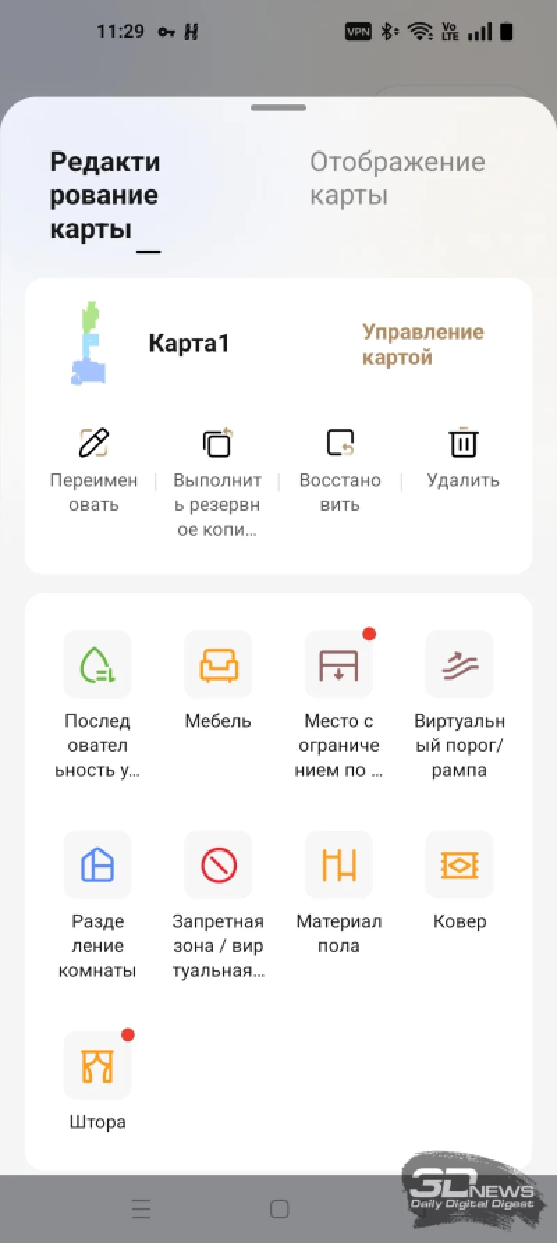 Чтобы «шестидесятая» модель функционировала корректно, требуется инсталлировать на телефон программу Dreamehome, которая существует для Android и iOS. Это приложение даёт возможность настраивать как сам робот-пылесос, так и его станцию автоматической очистки. Интерфейс утилиты полностью русифицирован и содержит множество вспомогательных указаний. Подсоединение устройства к домашней сети Wi-Fi с единым именем (SSID) для диапазонов 2,4 и 5 ГГц и смешанной защитой WPA2/WPA3 прошло без затруднений, а модель была распознана через QR-код. Весь процесс занял от силы пару минут — потребовались лишь регистрация в программе и доступ в сеть.