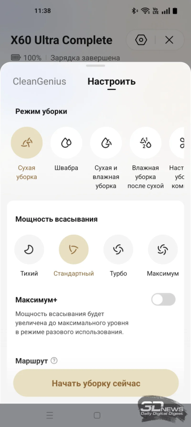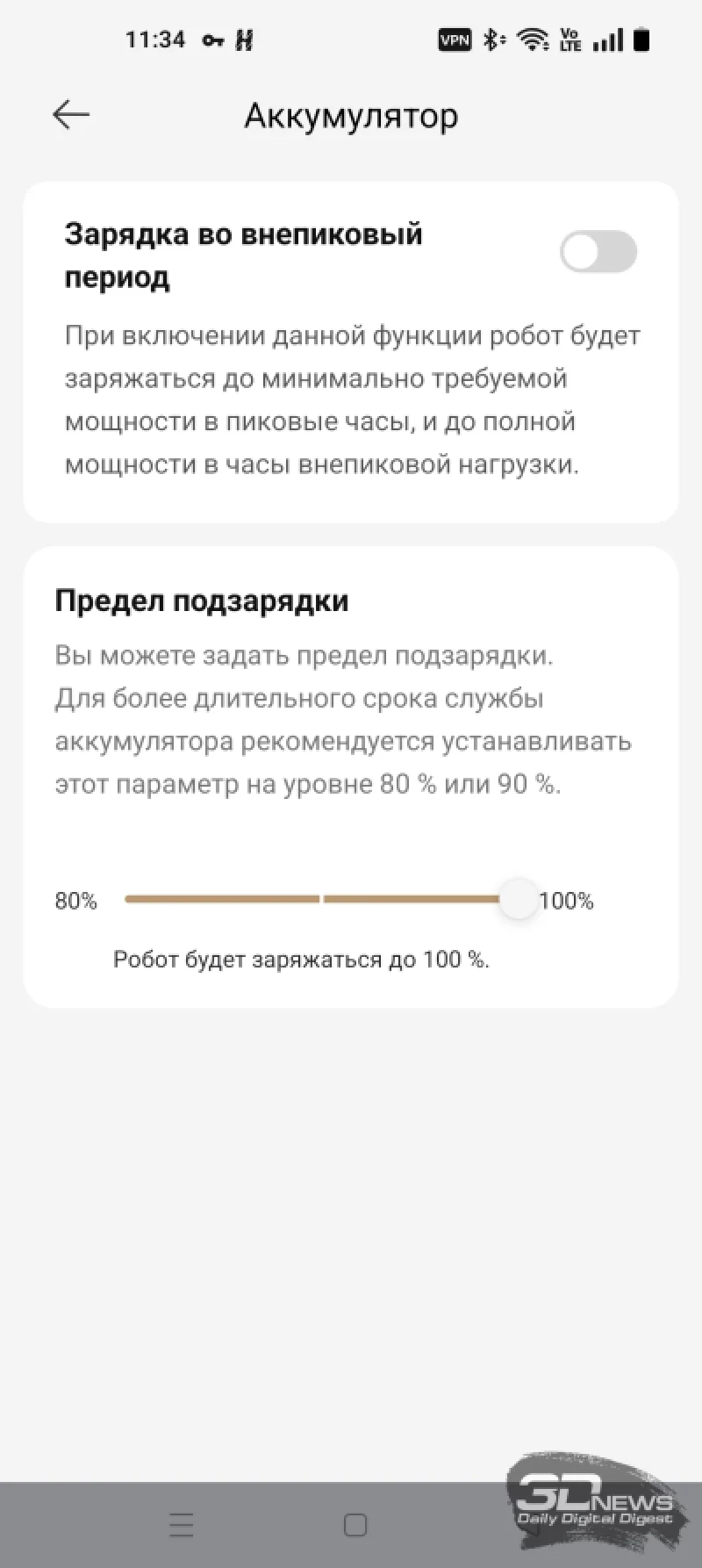 Модель X60 Ultra Complete обладает функцией, продлевающей срок службы аккумулятора. Через приложение Dreamehome пользователь может задать желаемый максимальный уровень заряда батареи. Док-станция поддерживает технологию ускоренной зарядки: полное восстановление энергетического запаса аккумулятора робота занимает всего 80 минут.