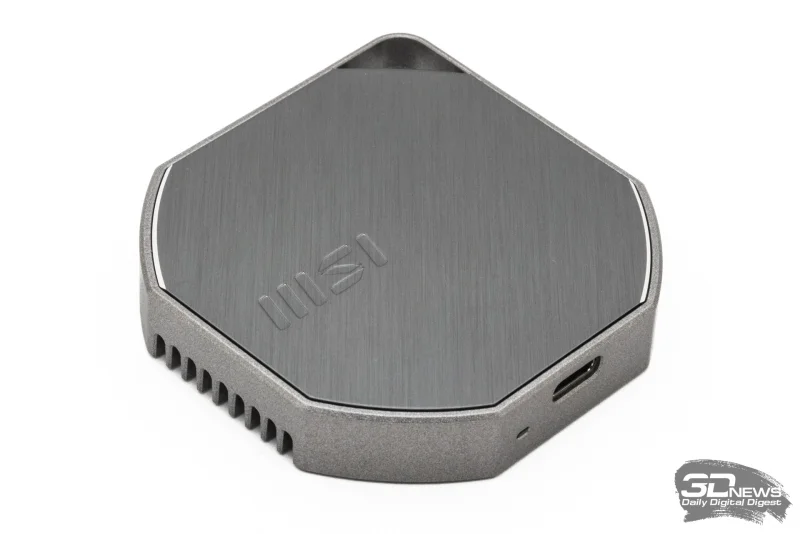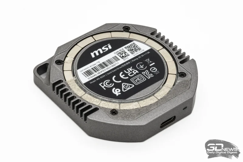Передняя сторона накопителя закрыта декоративной панелью с логотипом MSI, а на задней стороне находится резиновое кольцо, которое предотвращает скольжение устройства по столу и скрывает расположенные под ним мощные неодимовые магниты.