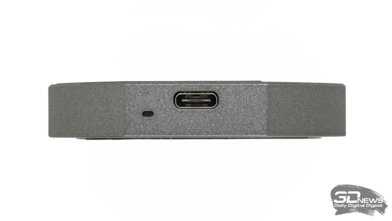 Для подключения Datamag 40Gbps к компьютеру или смартфону на одной из боковых сторон предусмотрен порт USB Type-C, а рядом с ним находится небольшой белый светодиодный индикатор работы. Данный порт функционирует по стандарту USB4 и полностью совместим с Thunderbolt 4/5, обеспечивая скорость передачи до 40 Гбит/с.
