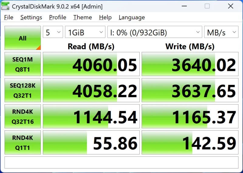 Результаты CrystalDiskMark демонстрируют, что Datamag 40Gbps почти полностью использует возможности интерфейса USB4. Скорость последовательного чтения достигает 4,06 Гбайт/с, а записи — 3,64 Гбайт/с, что соответствует заявленным характеристикам и даже слегка их превосходит. Фактически накопитель упирается в потолок пропускной способности 40-Гбит/с интерфейса, и ожидать заметно более высоких показателей от внешнего SSD такого класса не стоит.