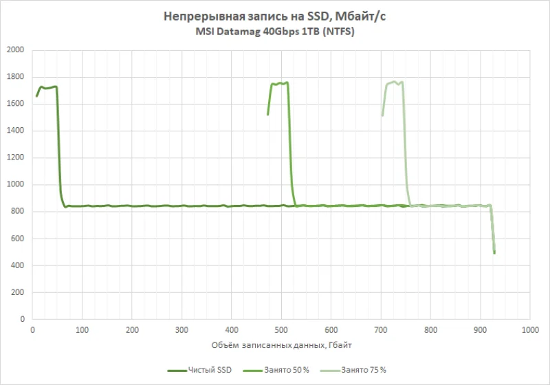 Чтобы составить более полное представление, мы измерили скорость непрерывного копирования файлов стандартными средствами Windows на MSI Datamag 40Gbps до полного заполнения его объёма при подключении через самый быстрый интерфейс USB4. Как в этом случае ведёт себя производительность, показано на графике ниже. На нём представлены три кривые, соответствующие тестированию в различных условиях: когда накопитель полностью пуст; когда он заранее заполнен данными наполовину; и когда на нём остаётся лишь четверть исходного пространства.
