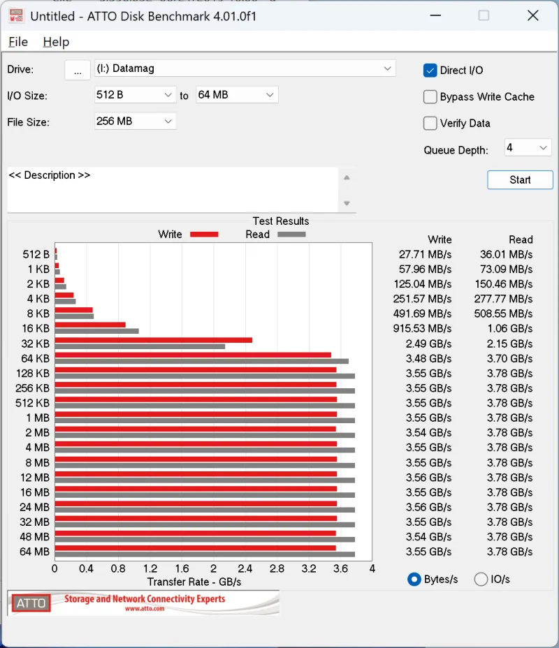 Другой тест, ATTO Disk Benchmark, позволяет оценить, как производительность накопителя меняется в зависимости от размера блока данных, и здесь Datamag 40Gbps также демонстрирует уверенные результаты. Уже при блоках размером 32–64 Кбайт скорость быстро достигает нескольких гигабайт в секунду, а начиная примерно с 128 Кбайт накопитель практически выходит на предельный уровень: около 3,7–3,8 Гбайт/с при чтении и примерно 3,5 Гбайт/с при записи.