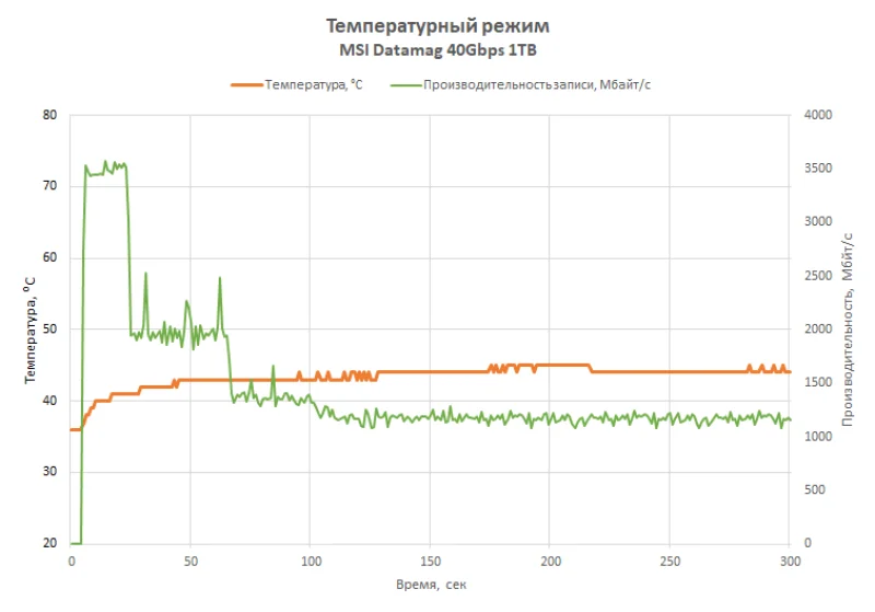 В завершение рассмотрим ситуацию с температурным режимом, тем более что на этот раз MSI уделила особое внимание отводу тепла от микросхем внутри накопителя. Для проверки мы подвергли SSD непрерывному потоку линейных смешанных операций с преобладанием чтения. За пять минут работы его температура поднялась с начальных 36 до 45 градусов, если ориентироваться на показания встроенного датчика.