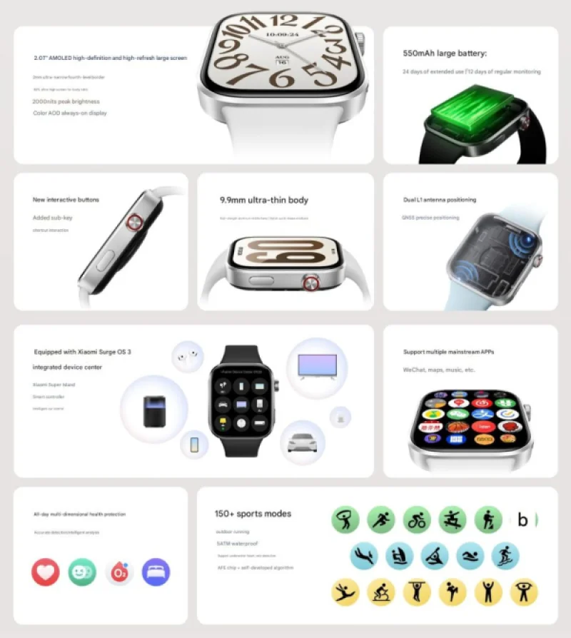 Часы наделены рядом интеллектуальных возможностей. Функция Xiaomi Super Island отображает оперативные уведомления о календарных событиях, доставках и оповещениях в динамическом формате. Smart Device Control даёт возможность управлять умной домашней техникой и автомобильными системами, включая прокладку маршрутов, настройку климат-контроля, регулировку сидений и управление музыкой.