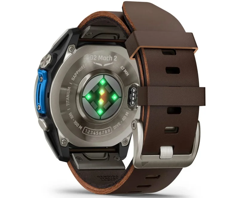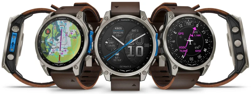 Умные часы Garmin D2 Mach 2 обеспечивают работу с детализированными цветными картами. Гаджет выпускается в двух вариантах исполнения — 47 и 51 мм. Меньшая версия комплектуется титановым ободом и кожаным ремешком оттенка Oxford Brown, тогда как увеличенная модель — затемнённым титановым безелем с DLC-покрытием и соответствующим перфорированным браслетом из титана. Дополнительно все модификации поставляются с сине-чёрным силиконовым ремнём QuickFit Pilot.