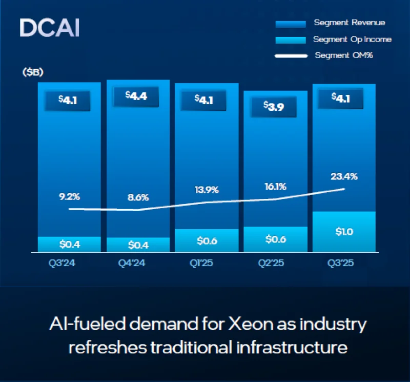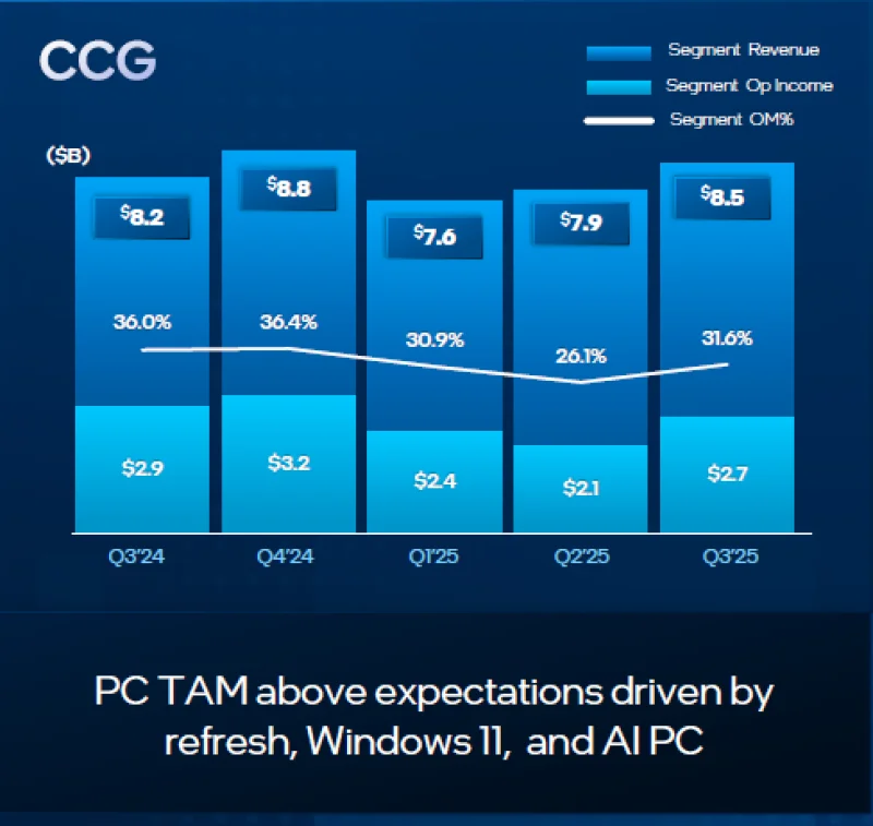 Фактически, квартальная выручка Intel превысила внутренние прогнозы корпорации. Ключевым драйвером роста в третьем квартале стало подразделение клиентских решений, увеличившее доход на 5 % до $8,5 млрд в годовом исчислении, тогда как серверное направление сократило выручку на 1 % до $4,1 млрд. Суммарно от продажи продуктов Intel получила $12,7 млрд, что на 3 % выше показателя прошлого года.