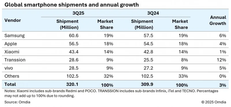 Суммарный объём мировых поставок смартфонов в третьем квартале достиг 320,1 млн единиц, что на 3% выше аналогичного периода прошлого года. При этом поставки в Северную Америку и континентальный Китай сократились, тогда как Азиатско-Тихоокеанский регион показал 5-процентный рост, а Ближний Восток и Африка — впечатляющие 25%.