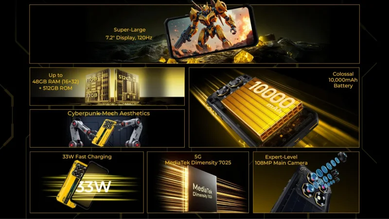 Модель обладает корпусом толщиной 14,9 мм, выполненным из алюминиево-титанового композита, и демонстрирует киберпанковский стиль, где ультрасовременный внешний вид сочетается с промышленной надёжностью. Устройство предлагается в жёлтом, серебристом и чёрном вариантах расцветки.