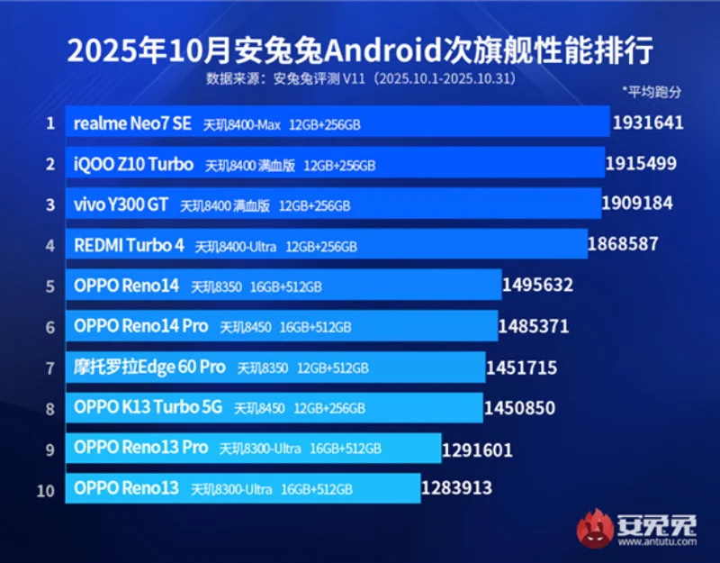 Среди среднебюджетных решений первенство захватил Realme Neo7 SE с чипом MediaTek Dimensity 8400-Ultra, набравший впечатляющие 1 931 641 балл. На второй и третьей ступени оказались iQOO Z10 Turbo и Vivo Y300 GT с результатами 1 915 499 и 1 909 184 баллов соответственно — оба используют Dimensity 8400. Четвёртое место занял Redmi Turbo 4, также работающий на Dimensity 8400-Ultra с показателем 1 868 587. Пятое и шестое места разделили Oppo Reno 14 и Reno 14 Pro на платформах Dimensity 8350 и 8450, набравшие 1 495 632 и 1 485 371 балл. Motorola Edge 60 Pro на Dimensity 8350 занял седьмую позицию (1 451 715), тогда как Oppo K13 Turbo 5G на Dimensity 8450 расположился на восьмом месте (1 450 850). Завершили десятку Oppo Reno 13 Pro и Reno 13 с чипом Dimensity 8400-Ultra, показавшие 1 291 601 и 1 283 913 баллов соответственно.