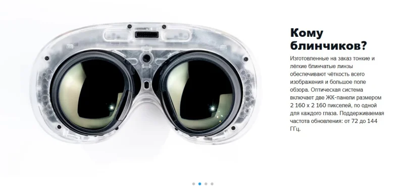 Гарнитура оборудована двумя ЖК-экранами с разрешением 2160×2160 пикселей на каждый глаз, поддерживающими частоту обновления от 72 до 144 Гц. Специальные блинчатые линзы обеспечивают горизонтальный обзор до 110 градусов. Межзрачковое расстояние регулируется в диапазоне от 60 до 70 мм, а шлем совместим с обычными очками шириной не более 140 мм. Для сравнения, в шлеме Valve Index используются экраны с разрешением 1440×1600 пикселей и частотой до 144 Гц на глаз.