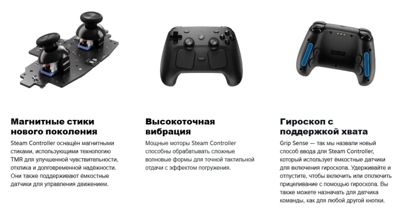 Наряду с новой Steam Machine и гарнитурой виртуальной реальности Steam Frame, Valve также анонсировала обновлённый контроллер Steam Controller. Его конструкция учитывает все возможные способы управления для игр любого жанра. Устройство совместимо со всеми платформами, на которых запущен клиент Steam.