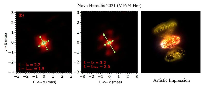 Недавно в журнале Nature Astronomy международная группа исследователей представила первые прямые снимки вспышек двух классических новых звёзд — V1674 Herculis и V1405 Cassiopeiae. Эти кадры, сделанные в реальном времени с помощью оптического интерферометрического массива CHARA (Центр астрономии высокого углового разрешения) в США, впервые позволили наблюдать динамику процесса, чья сложность поразила научное сообщество.