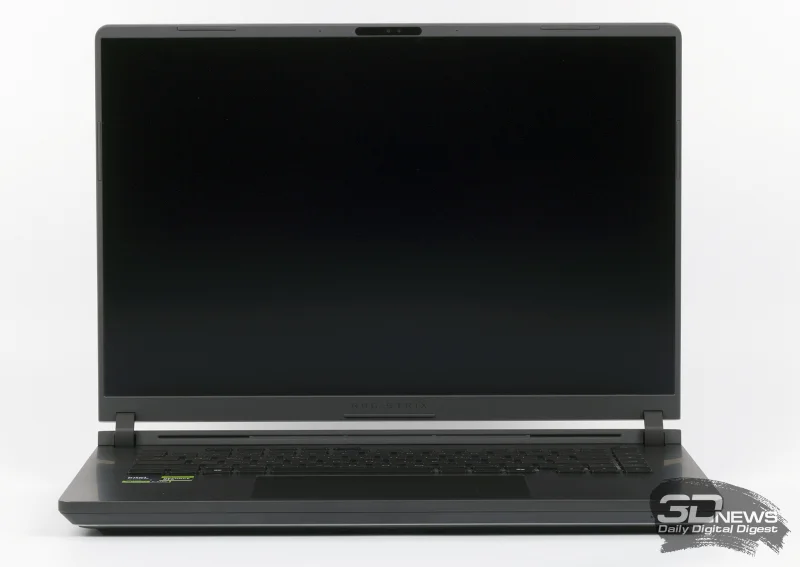 Крышка экрана изготовлена из алюминиевого сплава, тогда как остальные части корпуса — из матового пластика. Не стоит опасаться, что в устройстве премиум-класса использовано не так много металла: даже при интенсивном нажатии клавиатура ноутбука не прогибается. Модель обладает солидными габаритами, и здесь наблюдается любопытный визуальный эффект: из-за 16-дюймового экрана ROG Strix G16 G615 кажется более массивным, чем ROG Strix G18 G815. На самом деле младшая версия немного тоньше и легче: 2,65 кг против 3,2 кг. Внешний блок питания мощностью 280 Вт вместе с кабелями весит 0,8 кг. В обзоре 18-дюймовой версии я ранее отмечал: «Тем, кому ноутбук нужен всегда под рукой, стоит рассмотреть более компактный вариант — например, с 16-дюймовым экраном». ROG Strix G16 G615 можно назвать портативным лэптопом, но с определёнными оговорками.
