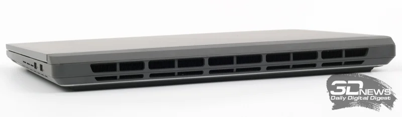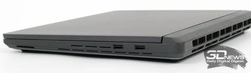 Несмотря на более компактный корпус, функциональность серии ROG Strix G16 G615 осталась прежней. Все порты расположены на боковых гранях. С правой стороны находятся два разъема USB 3.2 Gen2 Type-A. Слева размещен еще один аналогичный USB-порт, выход HDMI, слот RJ-45, аудиоразъем 3,5 мм и целых два порта Thunderbolt 5. Каждый из этих высокоскоростных интерфейсов обеспечивает пропускную способность до 120 Гбит/с, поддерживает подключение внешних блоков питания мощностью до 240 Вт и может работать как видеовыход DisplayPort 2.1 с технологией G-SYNC. Таким образом, значительно расширить возможности этого ноутбука с помощью дополнительных устройств не составит труда.
