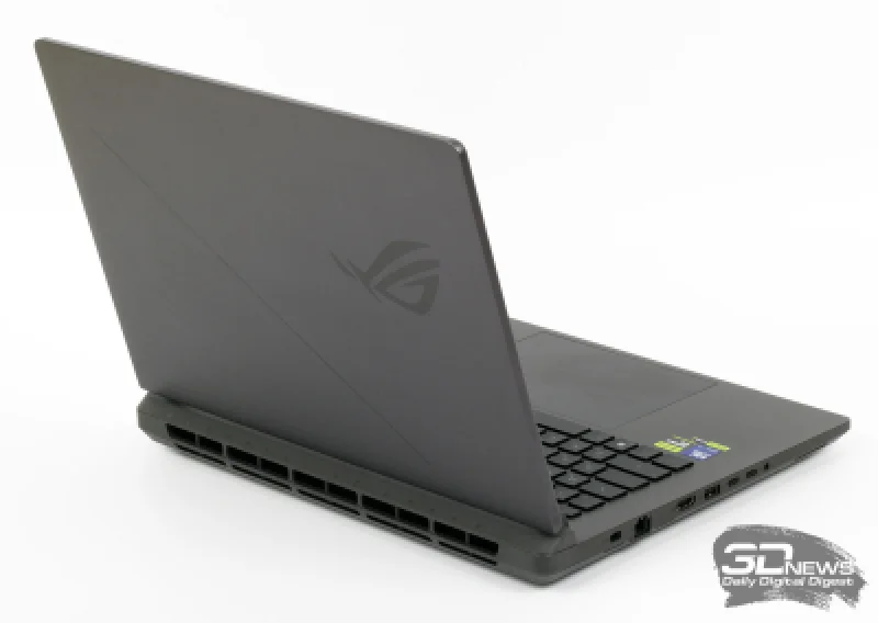 ROG Strix G16 G615 сразу обращает на себя внимание сдержанным оформлением: его корпус выполнен в ставшем уже традиционном тёмно-сером оттенке, а броские или чрезмерно яркие детали дизайна отсутствуют. На металлической крышке экрана элегантно размещён фирменный логотип «Республики Геймеров». Вентиляционная решётка, которая занимает всю заднюю панель, добавляет устройству ощутимую долю основательности. Безусловно, эта модель способна превратиться в праздничную иллюминацию — клавиатура и нижняя часть корпуса оснащены RGB-подсветкой. Тем не менее, ценителям строгого стиля ничто не мешает приглушить её свечение или отключить полностью.