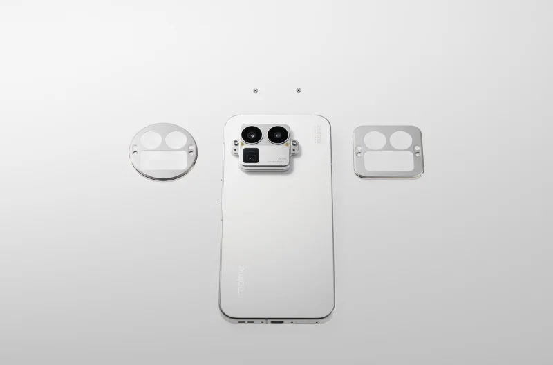 Особенностью является сменный декор камерного блока. Пользователи могут открутить стандартную панель и установить на её место другую. Доступны варианты любого дизайна, цвета и материала. По умолчанию смартфон комплектуется круглым элементом, но в коробке также предусмотрен альтернативный квадратный декор. Аппарат работает на операционной системе Android 16 с оболочкой Realme UI 7.0.