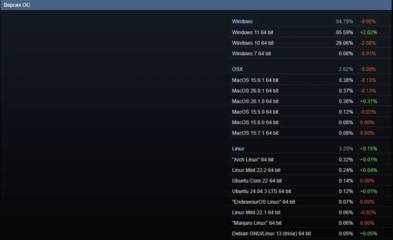 Ещё одной заметной тенденцией в статистике операционных систем стал рост интереса к Linux. Совокупная доля этой платформы поднялась до 3,20%, прибавив за месяц 0,15 п.п., что является историческим максимумом для Linux в рамках сервиса Steam.