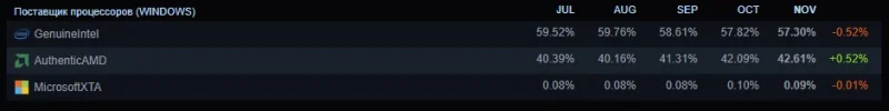 Тройку самых распространённых видеокарт AMD Radeon на платформе, если не учитывать интегрированную графику, формируют Radeon RX 6600 (0,89 % пользователей, снижение на 0,03 п.п. за месяц), Radeon RX 7800 XT (0,88 % пользователей, рост на 0,13 п.п. в ноябре) и Radeon RX 580 (0,66 % пользователей, снижение на 0,03 п.п.). Карты серии Radeon RX 9000 в статистике Steam по-прежнему отсутствуют.