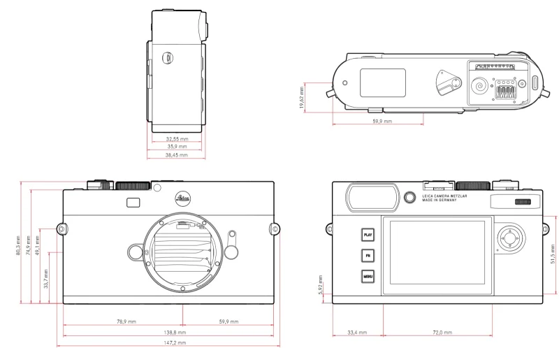 Корпус фотоаппарата Leica M EV1 выполнен из магниево-алюминиевого сплава и отделан искусственной кожей. Масса устройства достигает 484 граммов с установленной батареей и 402 граммов без неё. Геометрические параметры камеры представлены на иллюстрации ниже.