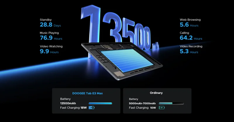 Обе модели комплектуются аккумуляторами большой ёмкости: у Tab E3 Pro она составляет 11 000 мА·ч, а у Tab E3 Max — 13 500 мА·ч, что позволяет долго обходиться без розетки. Поддержка быстрой зарядки мощностью 18 Вт обеспечивает оперативное пополнение запаса энергии.