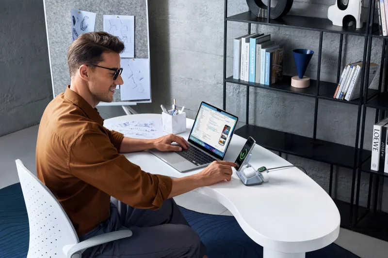 Тем, кто предпочитает комплексные решения для одновременной зарядки всех устройств, предназначена настольная станция 3-в-1 UGREEN MagFlow. Это не просто аксессуар, а полноценное рабочее решение для дома или офиса, ориентированное в первую очередь на владельцев техники Apple: можно одновременно заряжать iPhone (Qi2 25 Вт), наушники AirPods (5 Вт) и умные часы Apple Watch (5 Вт), плюс подключить дополнительное устройство через USB Type-C (5–10 Вт).