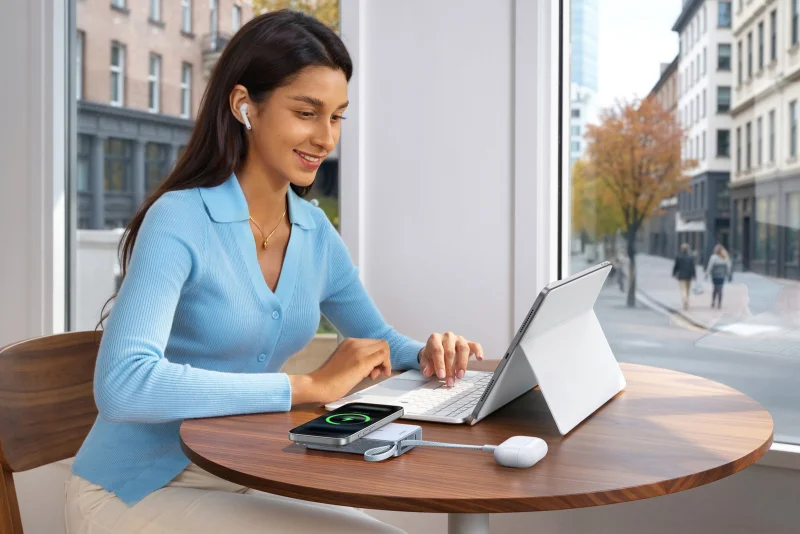 Устройство позволяет одновременно питать два гаджета — смартфон по стандарту Qi2 с мощностью до 25 Вт и, к примеру, наушники с функцией беспроводной зарядки до 5 Вт. Дополнительный разъём USB Type-C удобен для подключения умных часов или другого аксессуара. В конструкции реализованы продвинутые системы безопасности — защита от перегрева ThermalGuard, восемь уровней электронной защиты и автоматическое перераспределение мощности между устройствами.
