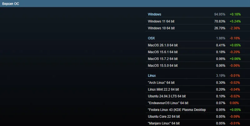 В остальных категориях лидеры не изменились. Операционная система Windows 11 используется 70,83% игроков в представленной статистике, а наиболее распространённой видеокартой остаётся Nvidia GeForce RTX 3060, которая присутствует на 6,26% компьютеров.