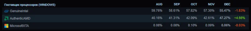 В процессорном рейтинге AMD преодолела рубеж в 40% ещё летом, а за последние четыре месяца добавила ещё 7 процентных пунктов; наиболее значительный рост пришёлся на декабрь, когда доля AMD увеличилась на 4,66 п.п., достигнув 47,27%. У Intel по итогам месяца показатель составил 55,47%. С выходом платформы AM5 компания AMD прекратила поддержку памяти DDR4, в то время как чипы Intel Raptor Lake Refresh, которые быстрее текущих Arrow Lake, совместимы как с DDR4, так и с DDR5.