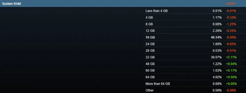 Ещё одним неожиданным трендом в свежей статистике Steam стал продолжающийся рост объёмов оперативной памяти в компьютерах, несмотря на её острый дефицит на мировом рынке. За последние месяцы розничные модули памяти подорожали более чем в два раза — вследствие огромного спроса со стороны индустрии искусственного интеллекта. Micron свернула потребительский бренд Crucial, чтобы сосредоточиться на производстве HBM и работе с корпоративным сегментом; при этом среди игроков уже 39,07% пользователей Steam, попавших в опрос, используют системы с 32 ГБ памяти, что на 2,11% больше. Для сравнения, 16 ГБ памяти установлены на 40,14% компьютеров. Возможно, такой резкий скачок вызван именно дефицитом — нерешительные пользователи, наконец, приняли решение обновить свои ПК.