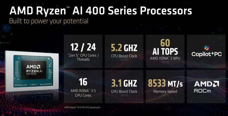 На выставке CES 2026 компания AMD анонсировала линейку мобильных процессоров Ryzen AI 400. По сути, это обновлённая версия прошлогодних моделей Ryzen AI 300, получившая ряд усовершенствований, включая повышенные тактовые частоты CPU, увеличенную производительность встроенного нейроускорителя XDNA 2 и другие улучшения.