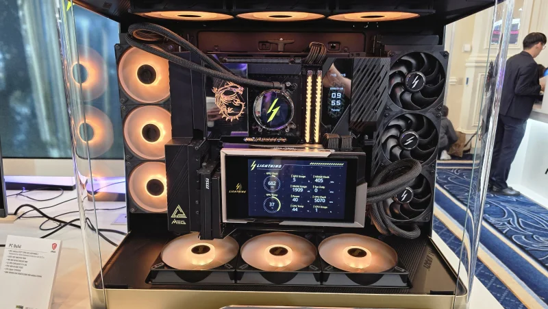 Кроме новых БП, на выставке MSI показала компьютерный корпус MEG Maestro 900R с панорамным обзором — его трёхсторонние гнутые стеклянные панели открывают вид на внутреннюю сборку практически с любого ракурса.