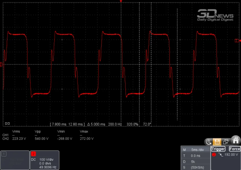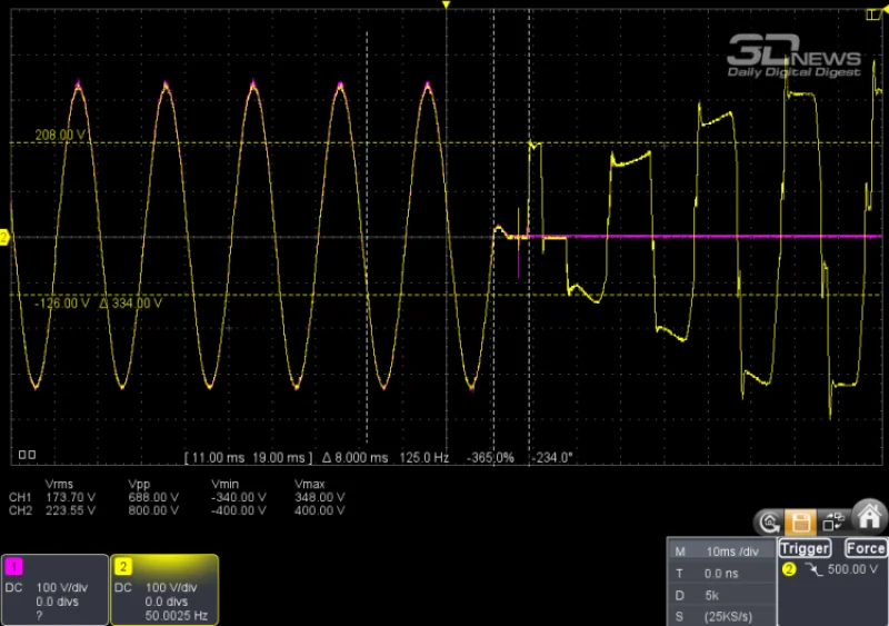 При этом полный размах напряжения установился спустя несколько колебаний, а начальное значение в 334 В соответствует действующему напряжению 118 В. Использованный в качестве нагрузки компьютерный БП «всемирного» стандарта с диапазоном входного напряжения от 90 до 265 В выдержал большинство (хотя и не все) повторные проверки без сбоев, в то время как устройства, предназначенные строго для 230 В, скорее всего, не справятся.