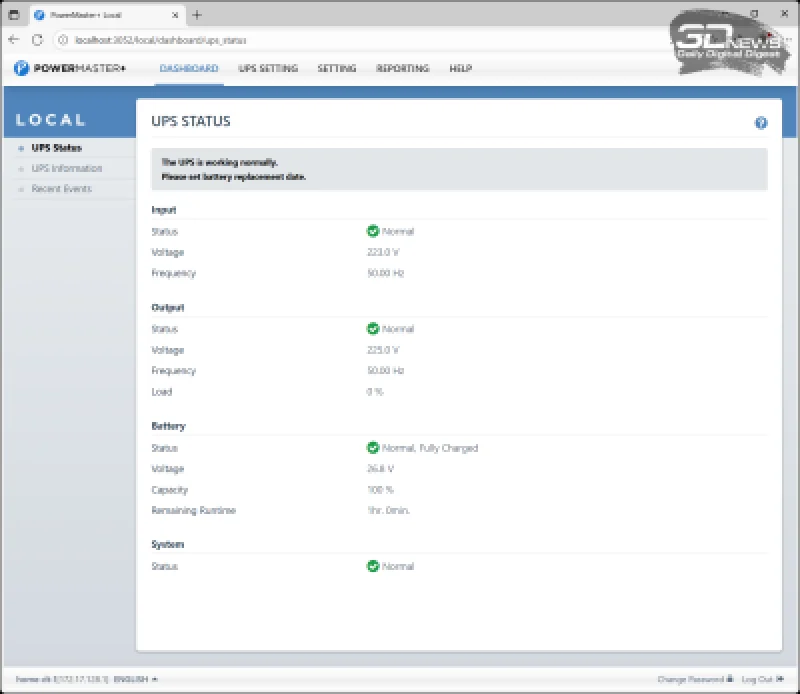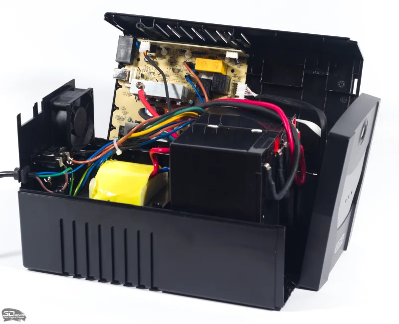 Трехступенчатый стабилизатор напряжения в устройстве активирует режим повышения, когда входящее напряжение падает до 195 В, выдавая на выходе 228 В. При снижении входного напряжения до 165 В и менее начинается питание от батареи. Режим понижения включается при входном напряжении 249 В, преобразуя его в 211 В. Верхний предел срабатывания стабилизатора не был достигнут из-за ограничений лабораторного трансформатора, используемого в тестовой конфигурации.