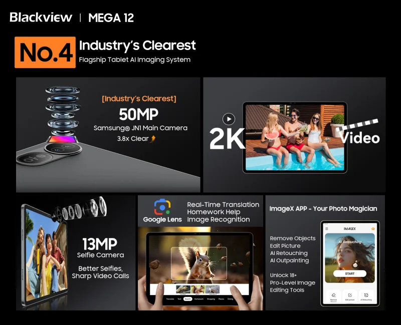 Планшет оснащён главной камерой на 50 мегапикселей с матрицей Samsung JN1, которая позволяет чётко сканировать документы, делать фотографии и записывать видео в повседневных ситуациях. Для селфи и видеозвонков спереди установлена 13-мегапиксельная камера, обеспечивающая более ясное изображение. Основная камера также поддерживает запись видео в разрешении 2K со скоростью 30 кадров в секунду.