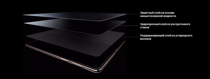 Однако для любого складного гаджета наиболее уязвимым элементом по-прежнему является внутренний дисплей с полимерным покрытием. На него, как и повсюду, нанесена защитная плёнка, края которой скрыты под рамкой, чтобы у пользователя не возникало желания её оторвать. Но защита хрупкого экрана на этом не заканчивается — он оснащён слоем на основе неньютоновской жидкости, ударопрочным слоем из сверхтонкого гибкого стекла и армирующей подложкой из углеродного волокна. В сравнении с прошлой моделью (HUAWEI Mate X6) стойкость к ударам возросла на 20%, а устойчивость к изгибу — в два раза.