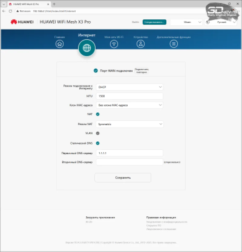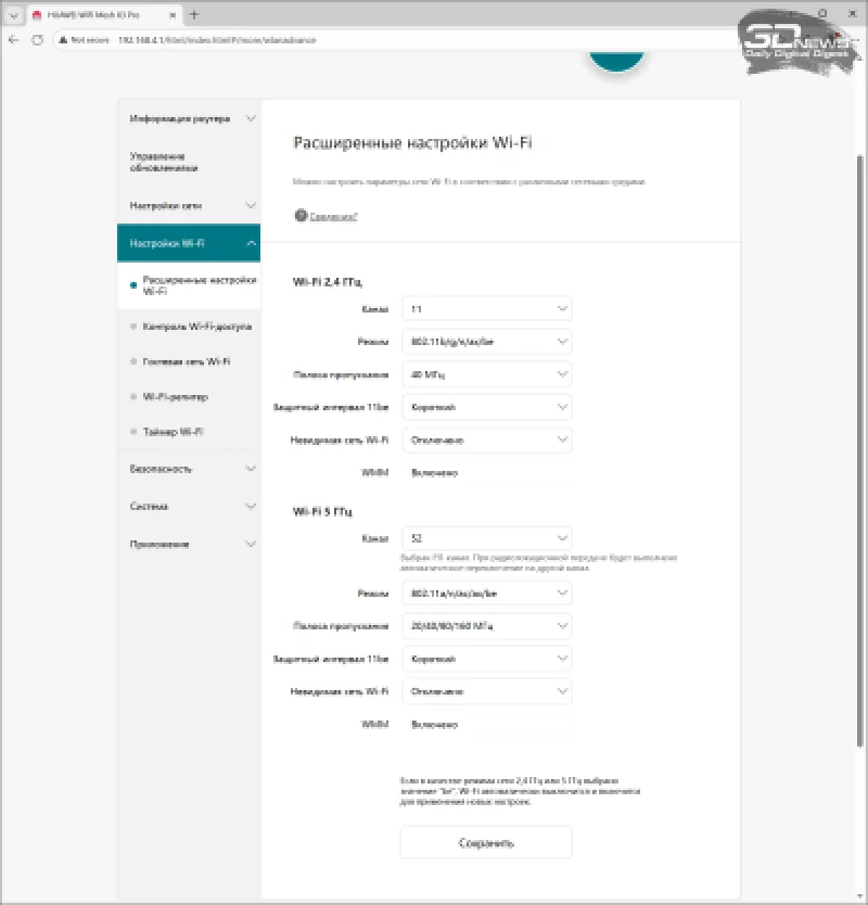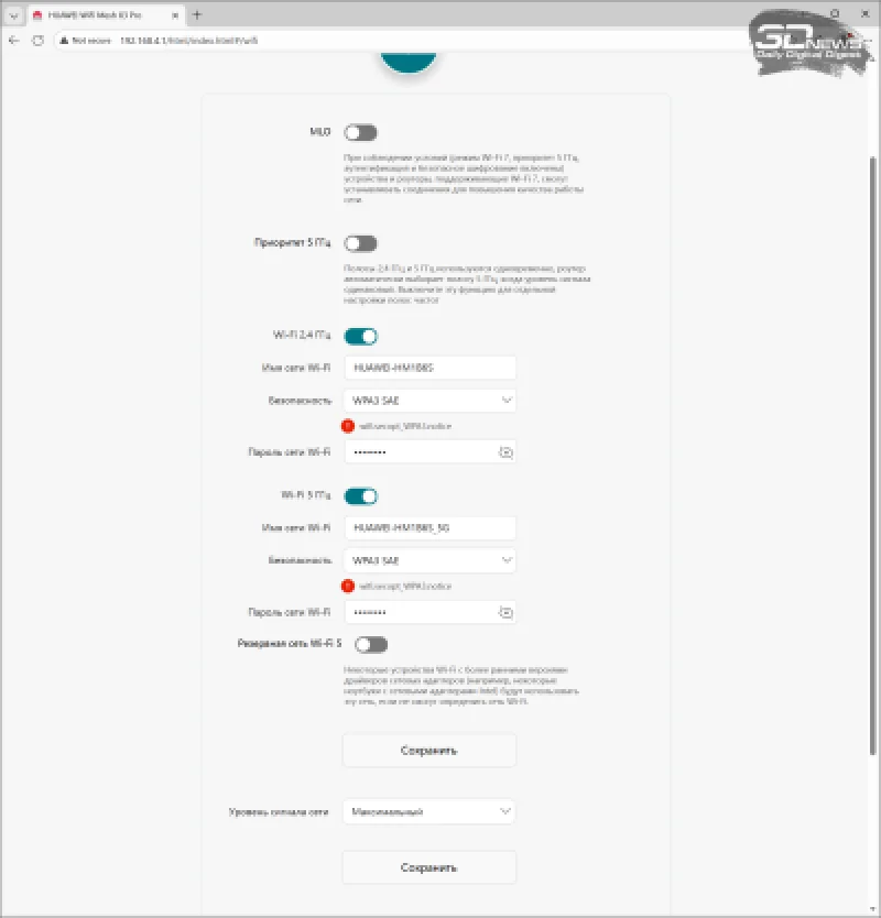 Совсем иначе обстоят дела с разделами, касающимися Wi-Fi. Роутер позволяет создать единое имя сети (SSID) для диапазонов 2,4 и 5 ГГц с функцией приоритета 5 ГГц (так называемый Band Steering), поддерживает MLO, а также резервный SSID в диапазоне 5 ГГц для устаревших устройств и гостевую сеть. Диапазон 5 ГГц в тестовом экземпляре HUAWEI WiFi Mesh X3 Pro работает с большинством «международных» каналов — с 32 по 64 и с 100 по 140. Часть из них требует лицензирования в России и, вероятно, будет отключена в серийных моделях. Установить региональный код Wi-Fi нельзя, и он не передается в эфире. Доступна трехступенчатая регулировка мощности передатчика.