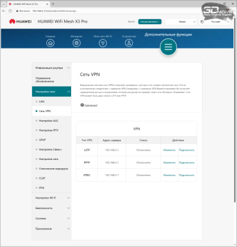 Из VPN-клиентов поддерживаются только PPTP (с шифрованием MPPE или без), L2TP без IPsec и чистый IPsec. Функций VPN-сервера (как и DDNS) и файлового сервера в прошивке не предусмотрено.