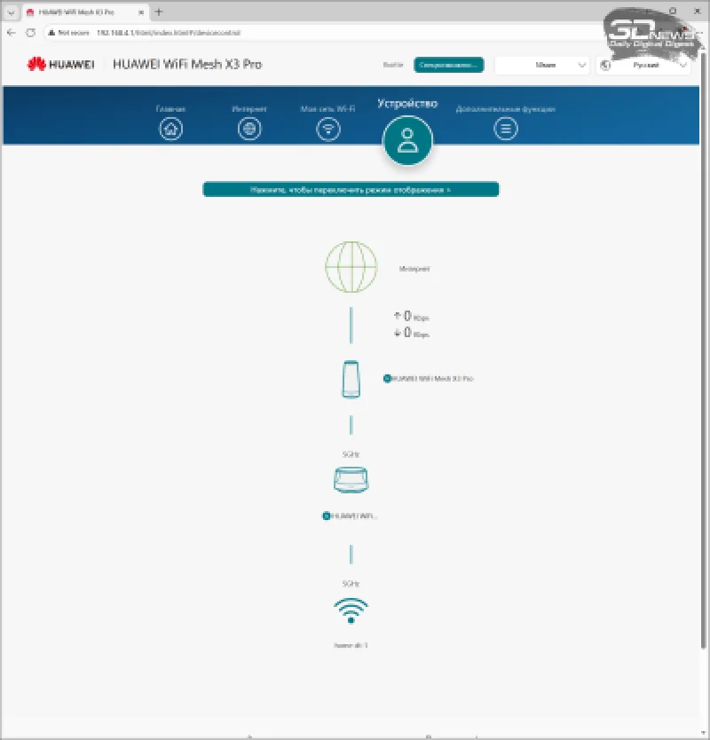 Роутер HUAWEI WiFi Mesh X3 Pro функционирует на базе собственной ОС HarmonyOS. Ее интерфейс ориентирован на обычных пользователей, а не на продвинутых, что отражается в ограниченном наборе опций. Однако ключевые функции, востребованные большинством владельцев, здесь присутствуют, а процесс настройки устройства максимально упрощен.