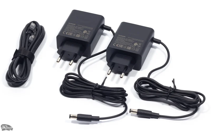 Комплект поставки HUAWEI WiFi Mesh X3 Pro включает блоки питания для каждого устройства и черный соединительный кабель.
